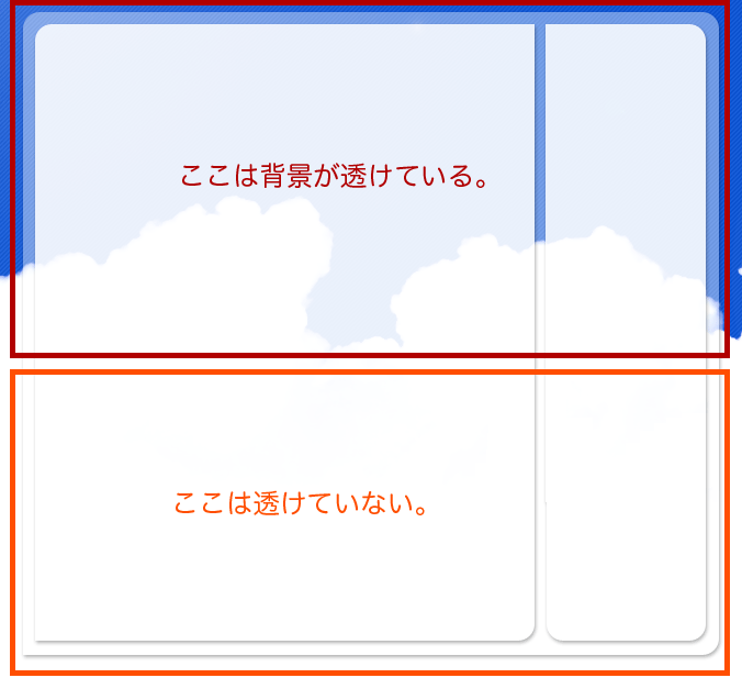 CSSの部分でいくつかハマりまくったのですが、一番の難関だったのが、記事が載っかる部分の「上部だけ」を透明にすることですた。